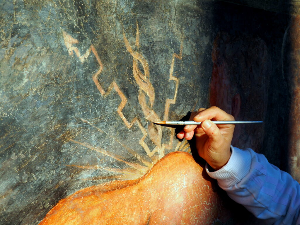 Lo stato di conservazione degli affreschi era preoccupante. Nonostante ad una prima occhiata sembrava si fossero conservate solo le fasce appena al di sotto del tetto, era ancora possibile leggere le partizioni architettoniche dell’intero prospetto, così come le decorazioni figurative e araldiche presenti nei riquadri del primo e secondo piano nobile. Dopo un’approfondita ricerca storica è stato eseguito l‘ intervento di restauro conservativo, verificando e agendo anche sulle operazioni di un intervento eseguito negli anni ’70, non più adeguato.