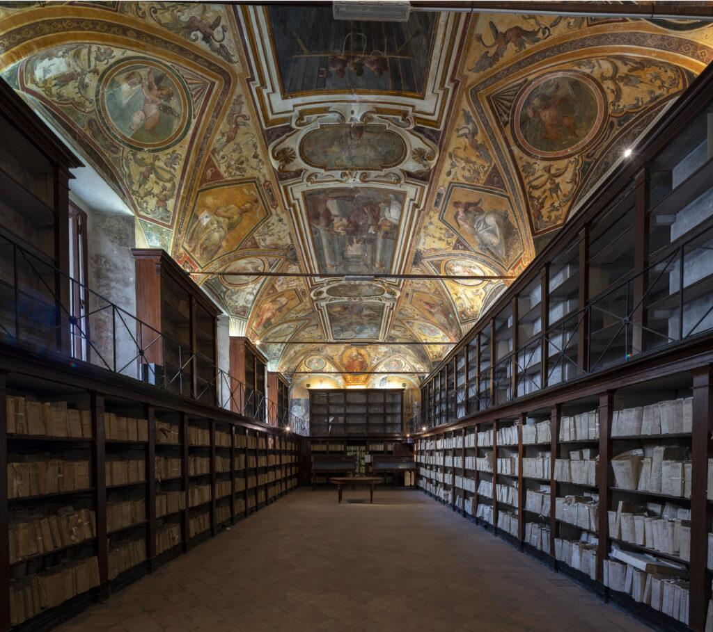 Il monastero, trasformato nel 1845 in sede dell’Archivio Generale del Regno, è uno dei più grandi e ricchi istituti religiosi di Napoli. Oltre al grande chiostro in marmo costruito nel XVI secolo sono stati restaurati i dipinti murali seicenteschi della sala catasti. Gli affreschi seicenteschi di Belisario Corenzio alle pareti raffigurano scene dei miracoli di Gesù. Erano andati perduti perché coperti nella metà dell’ 800 dalle grandi scaffalature lignee dell’ Archivio di Stato. Sulla volta sono raffigurate parabole, figure allegoriche e scene del Vangelo dipinte a fresco e a secco.